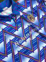 The shirt features fully stitched Football League sleeve patches and flock numbers, neither of which were commercially available.