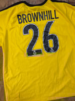 This shirt was issued to young Liam Brownhill who featured on the bench several times but never made a first team appearance. Features correct size and style Football League name set. Sleeve patches were previously on the shirt but these have been removed, the outline of them is still visible. Shirt is in great nick. Size XL.